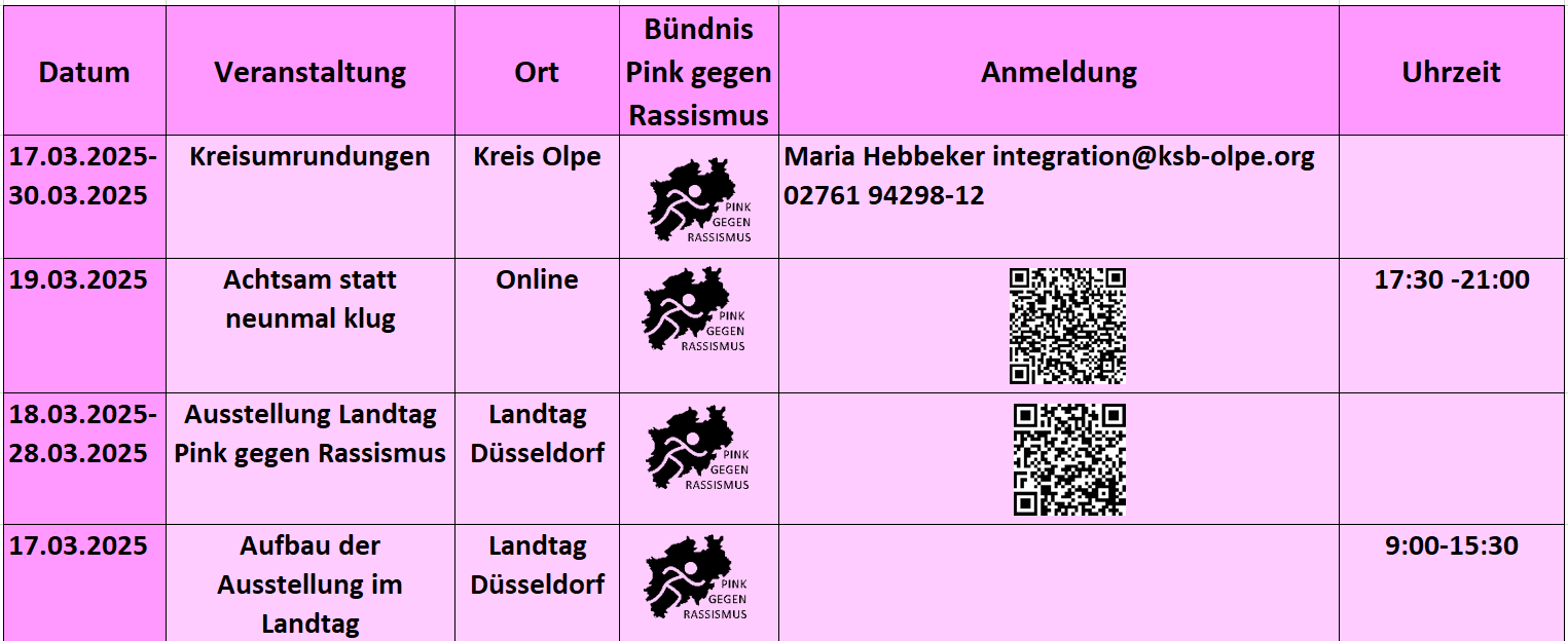 Nutzt bei euren Veröffentlichungen gerne folgende Hashtags: #KSBOlpe #pinkgegenrassismus #bewegtgegenrassismus #sportbekenntfarbe #InternationaleWochenGegenRassismus #IWgR #IWgR25 #HaltungZeigen #DEMOKRATIEundRESPEKT